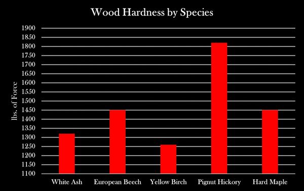 Wood hardness is tested by recording the amount of force required to embed a roughly half-inch diameter steel ball halfway to its diameter.