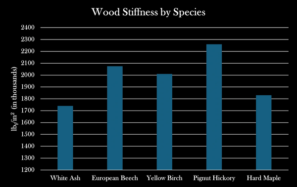 Wood stiffness is also known as MOE or Modulus of Elasticity. It is essentially a ratio of the amount of stress placed on the wood in lbs. to the amount of deformation that the wood experiences (how much it bends) in square inches. The higher the value, the stiffer the wood.